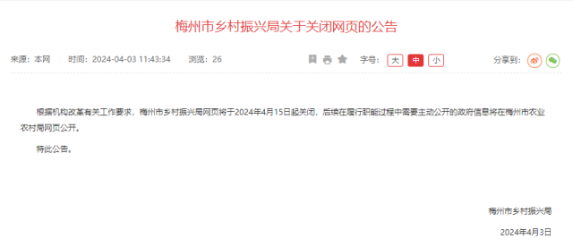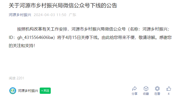 4月3日,河源市乡村振兴局微信公众号发布公告表示,按照机构改革有关工作安排,该号将于4月15日关停下线。梅州市乡村振兴局网站亦发布公告称,根据机构改革有关工作要求,梅州市乡村振兴局网页将于4月15日起关闭,后续在履行职能过程中需要主动公开的政府信息将在梅州市农业农村局网页公开。