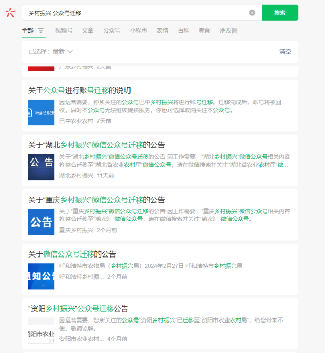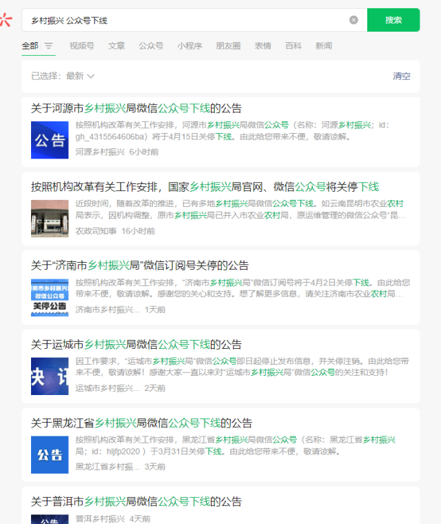 随着机构改革的层层推进,已有多地乡村振兴局官网、微信公众号迁移或下线。在微信搜一搜界面,输入“乡村振兴 公众号迁移”或“乡村振兴 公众号下线”等关键词,可以检索到多条乡村振兴局官方微信公众号迁移或关停注销的公告。
