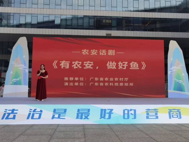 在法治文艺展演区域,由广东省农业科学院农业质量标准与监测技术研究所(下称“省农科院质标所”)带来的优秀法治文艺作品情景剧《有农安,做好鱼》精彩上演,得到现场观众的一片喝彩。据悉,该剧由省农科院质标所科技人员自编自演,旨在强化农产品质量安全主体责任,推动以食用农产品承诺达标合格证为载体的产地准出与市场准入衔接工作落实,宣传贯彻新修订的《中华人民共和国农产品质量安全法》。