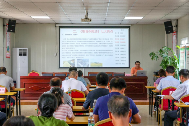 广东省农业科学院水稻研究所陈可副研究员向参会学员进行了《中华人民共和国粮食安全保障法》宣贯,并重点讲解通过选择优质水稻品种、配套栽培技术以及病虫害防控措施(良种+良法+防控)促进我省水稻单产提升。