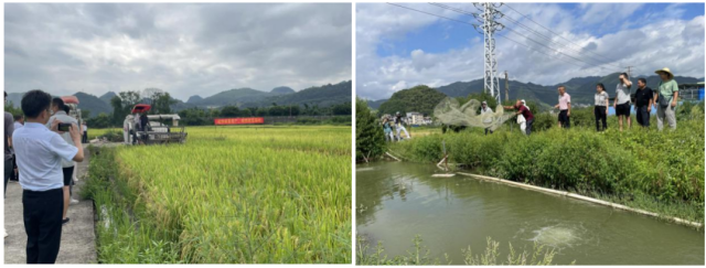 培训会上,专家对学员们开展了早稻机收、丝苗米测产等实地授课与技术指导,并现场观摩了广东省农业科学院水稻研究所育成的丝苗米新品种与“水稻+罗氏沼虾”综合种养技术,使学员们对稻渔综合种养有了直观的认识。