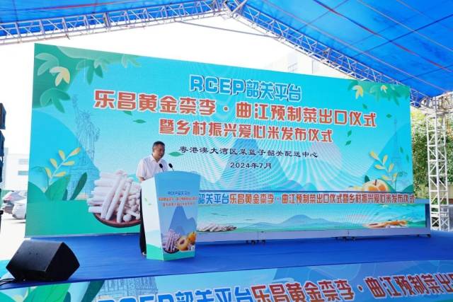 7月26日,RCEP韶关平台乐昌黄金柰李、曲江预制菜出口仪式暨乡村振兴爱心米发布仪式在粤港澳大湾区菜篮子韶关配送中心举办。一辆辆装满乐昌黄金柰李和曲江预制菜的货车缓缓鸣笛驶出,在场观众纷纷举起手机,记录下这一激动人心的时刻。