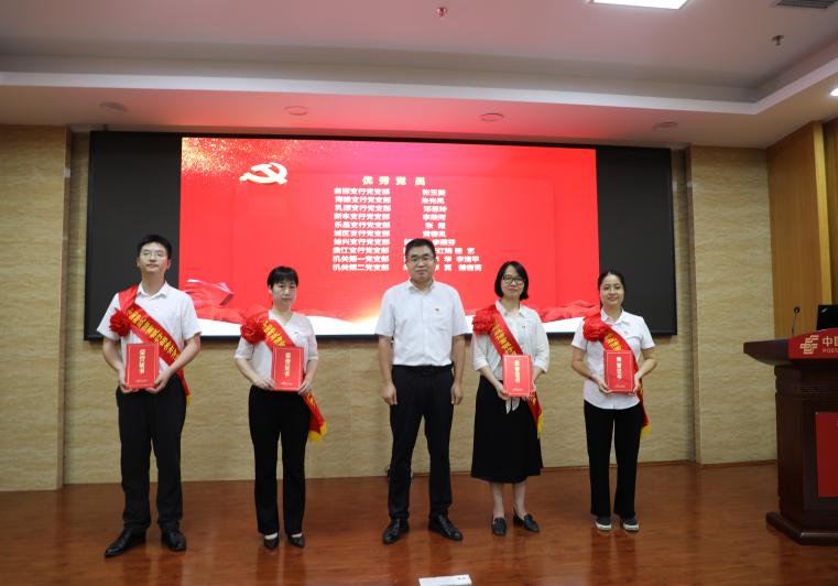 会上,宣读了《关于表彰2022-2024年中国邮政储蓄银行韶关市分行“先进基层党支部、优秀共产党员、优秀党务工作者”的决定》,播放了韶关市分行先进典型邮储文化理念视频展示,表彰优秀共产党员17名,优秀党务工作者3名,先进党支部2个,行领导班子为受表彰的个人和集体颁发了荣誉证书,现场鼓励受到表彰的先进单位和个人,要继续保持勇于开拓、争创一流的奋斗精神,进一步发挥示范带头作用,再创佳绩,再立新功!