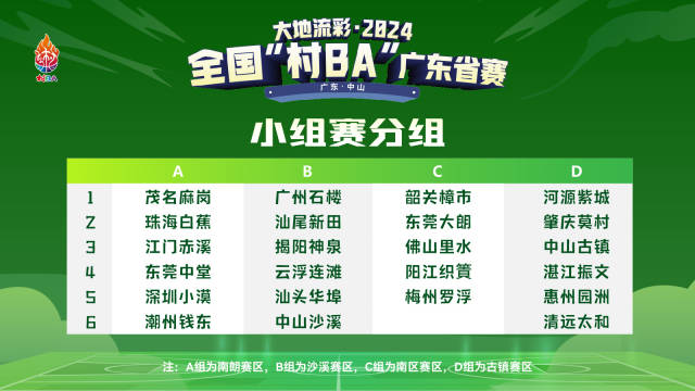 最终经过抽签,主场作战的中山沙溪落位B组,中山古镇落位D组,特邀球队东莞大朗落位C组。其中,A、B、C、D组比赛分别在南朗、沙溪、南区和古镇赛区进行。具体分组结果如下——