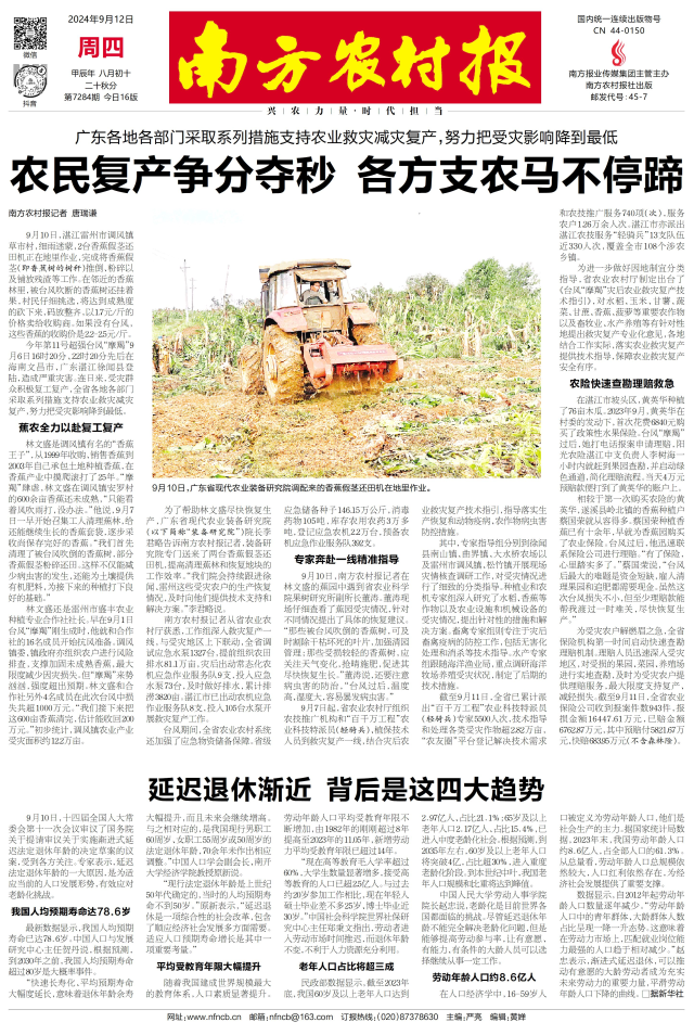 截至9月11日,全省已累计派出“百千万工程”农业科技特派员(轻骑兵)专家5500人次,技术指导和处理各类受灾作物超2.82万亩,“农友圈”平台登记解决技术需求和农技推广服务740项(次),服务农户1.26万余人次。湛江市亦派出湛江农技服务“轻骑兵”13支队伍近330人次,覆盖全市108个涉农乡镇。