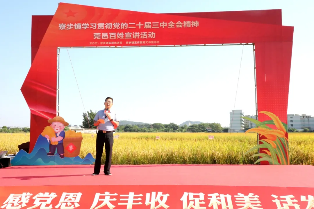 寮步镇党委委员黎德庆带来《守护粮食安全端牢中国饭碗合力推动寮步镇粮食稳产保供》主题宣讲。他表示,保障粮食安全是关乎国计民生的头等大事,寮步始终把“菜篮子”“米袋子”“果盘子”作为安民之基的重要任务来抓,希望通过在稻田里的宣讲,引导大家共同推动粮食安全保障工作。