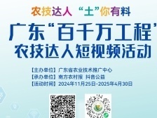 11月14日,广东省农业技术推广中心发布《关于举办广东“百千万工程”农技达人短视频活动的通知》(以下简称《通知》),联合南方农村报、抖音公益等单位共同举办“广东‘百千万工程’农技达人短视频活动”,围绕种植业、畜牧业、渔业、农机、农产品市场营销等领域,孵化培育一批传播力广、带动力强、技术过硬的优秀农技短视频达人,助力乡村特色产业发展。