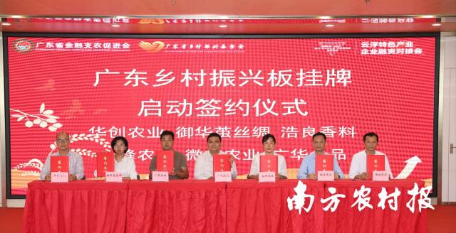 现场还举办广东乡村振兴板挂牌启动签约暨银行授信仪式,为乡村振兴板上板企业与参会企业提供信贷支持和金融服务。据介绍,在广东省金融支农促进会、广东省乡村振兴基金会、云浮市人民政府以及各金融机构的推动支持下,广东小阳生态农业有限公司、云浮市爱丽孚农业有限公司、广东银田农业科技有限公司、郁南县亿丰农业科技有限公司、郁南县坤为农业有限公司、郁南县亲群食品有限公司等企业成功签约。通过对优质涉农企业进行筛选评定,共对广东乡村振兴板以及此次参加活动的农业企业预授信15.16亿元。