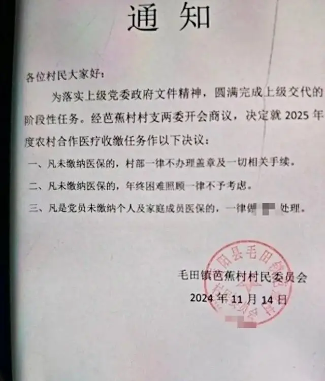 日前,一则湖南某村委会收缴医保的通知在网上传播,引发关注。相关图片显示,一则盖有“岳阳县毛田镇芭蕉村村民委员会”印章、发给该村村民的通知称,为圆满完成上级交代的阶段性任务,该村村支两委经开会商议,就2025年度农村合作医疗收缴任务作了三项决议,其中一条为“凡未缴纳医保的,年终困难照顾一律不予考虑”。