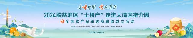 11月29日,2024脱贫地区“土特产”走进大湾区推介周启动暨全国农产品采购商联盟成立活动在广州举办,104个脱贫县(市区)超过360种“土特产”首次组团来到广州、来到粤港澳大湾区,超过230家经营主体参展。