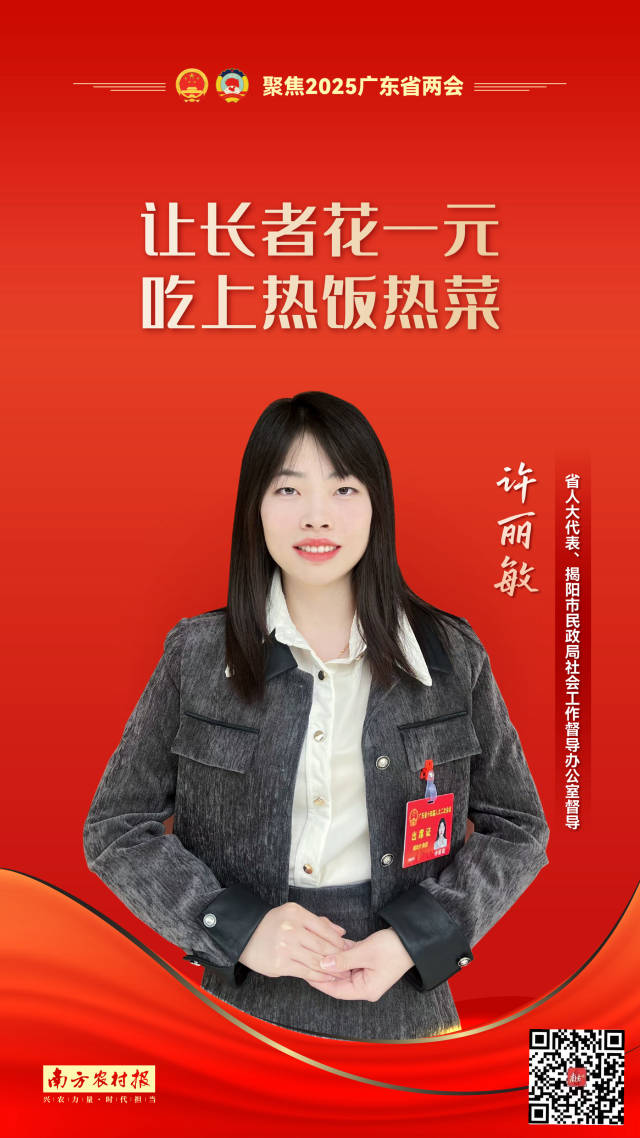 作为一名扎根在基层的社会工作者,养老、教育、医疗等民生实事始终是“95后”省人大代表、揭阳市民政局社会工作督导办公室督导许丽敏关注的重点。今年,许丽敏带着“完善养老服务体系建设”“保障‘双百工程’社工薪酬待遇”等建议,希望为推动县域养老服务高质量发展贡献力量。