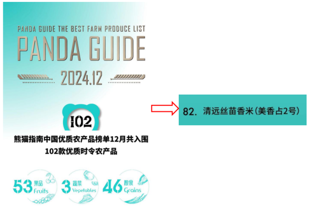近日,熊猫指南发布中国优质农产品榜单,“清远丝苗香米”以其细长晶莹、白净通透的外表,丰富的油质含量,馥郁的香气,软韧有劲、细腻可口的口感,俘获广大消费者及测评专家的心,成功入围熊猫指南中国优质农产品2024年12月榜单。