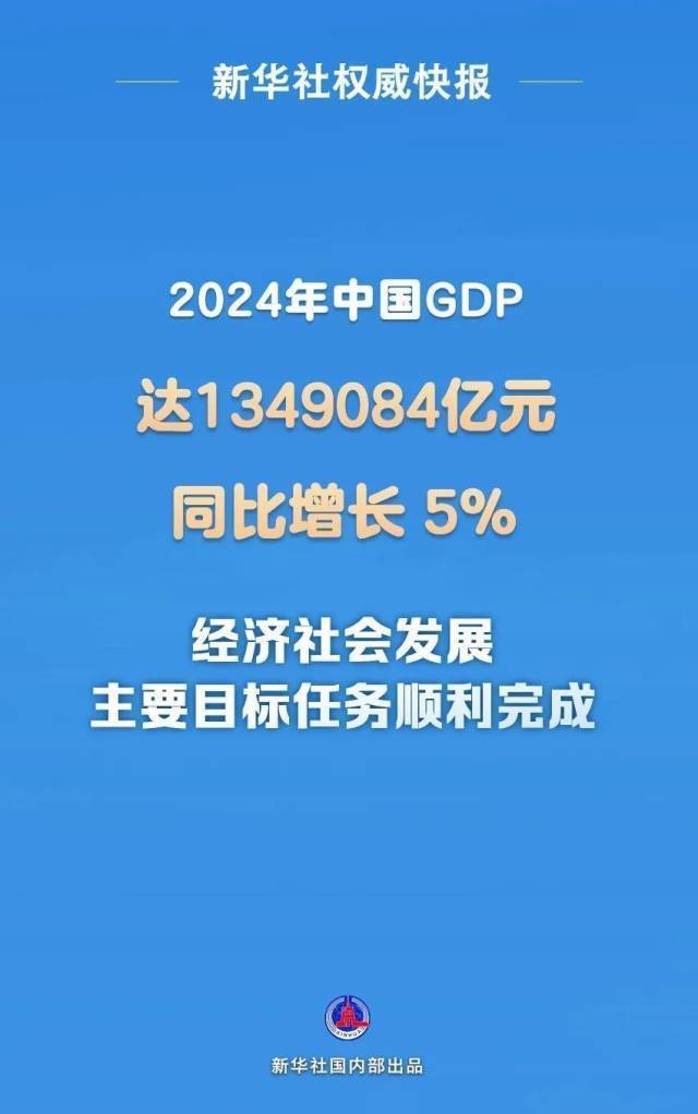 国家统计局1月17日发布数据,初步核算,2024年中国国内生产总值(GDP)达到1349084亿元,按不变价格计算,比上年增长5%。