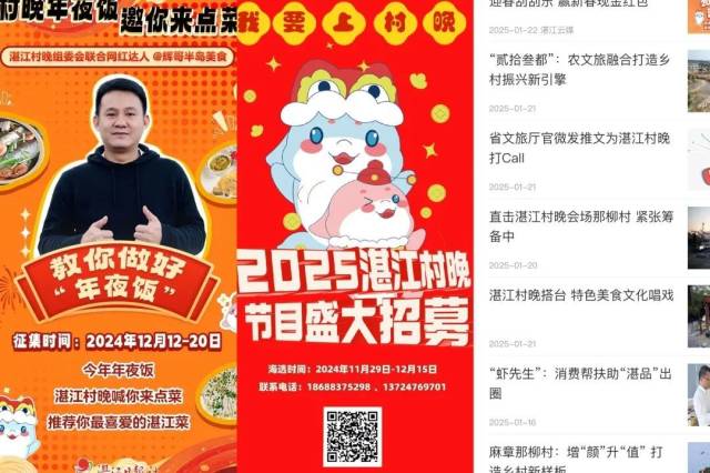 自2024年11月29日,第二届湛江村晚正式启动以来,村晚组委会还启动了湛江村晚短视频征集、“村晚年夜饭,邀你点菜”等系列活动,并发动湛江村晚推荐官新农人林晓云、“三条锦里”、“三个咸鱼”、“墨西不是哥”、“陈椰迅”等网红达人持续创作短视频,积极推介湛江好景好物,为村晚宣传助力。