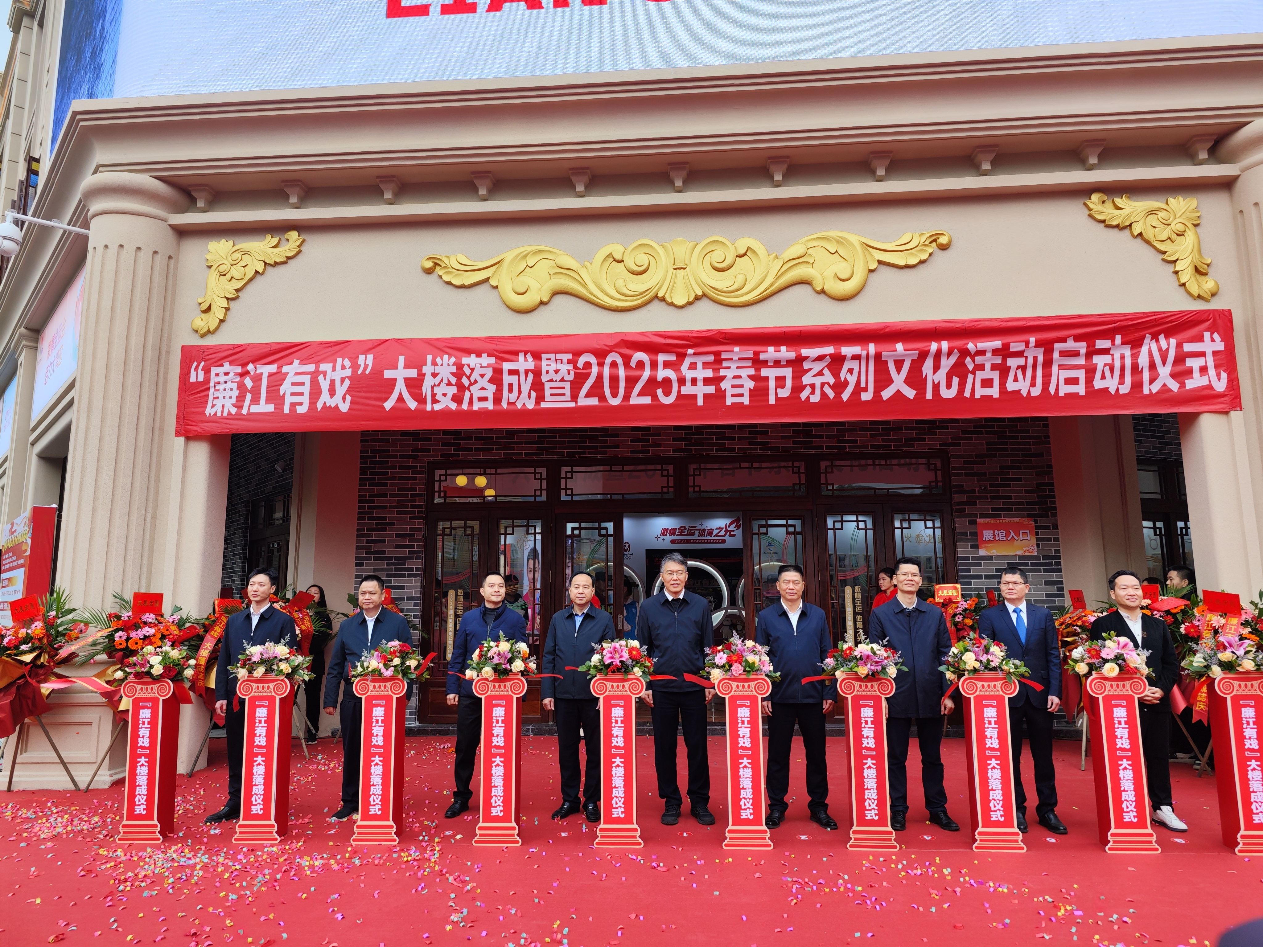 湛江市委常委、宣传部部长郑浩然,湛江市文化广电旅游体育局副局长莫智铣,廉江市委书记陈恩才,廉江市人大常委会主任陈炜飞,暨南大学新闻与传播学院教授麦尚文,广东振远文化集团董事长梁振运,十五运会和残特奥会广州赛区执委会新闻广电部成员何运涛等出席“廉江有戏”大楼落成暨2025年春节系列文化活动启动仪式,为“廉江有戏”大楼落成剪彩,并参观了奥运火炬文化展和小林漫画展。