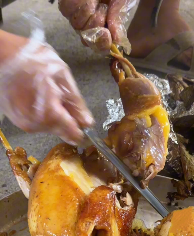 瓮鸡又称“打鸡瓮”,是湛江本地颇具特色的吃法,常见于春节期间。整个制作过程充满乐趣,用调好的酱油涂满鸡身,再用姜葱蒜填肚,随后用荷叶包裹和锡纸封紧,然后放进“老手”搭建好的窑房“烤场”,用锄头把瓮推倒,利用高温把鸡“闷”熟。烘烤片刻后,便可以尝到色泽金黄、外皮酥脆的“瓮鸡”。