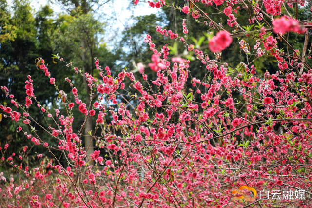 随着天气回暖,近日,帽峰山景区内的百余株桃花竞相绽放,宛若一幅美丽的水彩画卷。进入帽峰山景区,来到古庙广场前,沿着古庙广场旁边的千年古道往下走,就能看到成片的桃花林。只见百余株桃花热烈绽放,枝干上密集的花朵簇拥成团,新抽的嫩叶在花影间若隐若现,桃花散发的淡淡清香,引来蜜蜂穿梭其间采花蜜。
