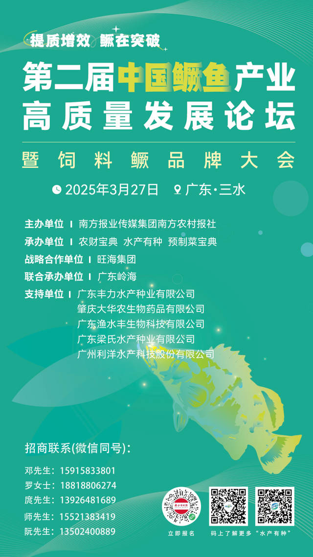 那当前鳜鱼育种技术有哪些最新进展,养殖模式又有哪些创新与实践?3月27日,第二届中国鳜鱼产业高质量发展论坛暨饲料鳜品牌大会将在广东佛山三水举办,这场由政府、科研机构、龙头企业与专业行业媒体联合举办的行业盛会,旨在推动解决当前鳜鱼产业难题,期待您的到来!