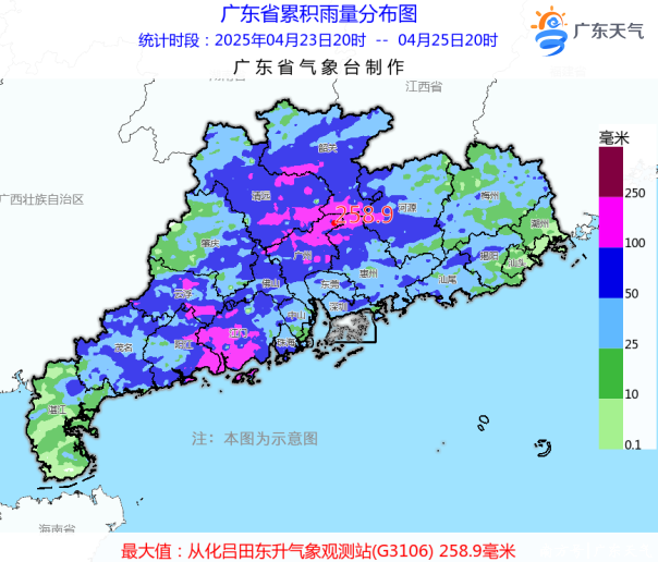 这次过程具有“移动性强、大暴雨区域集中”的特点,并伴有雷电和8~10级短时大风。韶关、清远、广州、惠州北部、江门、云浮、阳江先后出现了暴雨局部大暴雨,全省平均雨量48.8毫米,广州从化区吕田镇录得全省最大累积雨量258.9毫米,江门台山北陡镇录得全省最大1小时雨量83毫米,广州南沙区黄阁镇录得全省最大阵风33.1米/秒(12级)。27日白天起,雷雨趋于活跃。明显降水时段为27日午后到夜间,以短时强降水和8级左右雷雨大风为主,主雨区位于中北部。