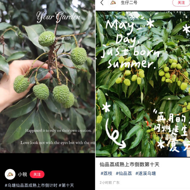 5月初,拇指大小的仙品荔青果已成串垂坠。距离5月15日正式开摘还有十天,全镇2.5万亩仙品荔正褪去青涩,而比果实更早“活跃”的,是新农人们的小红书账号——从果农、人大代表到乡村教师,满屏皆是“乌塘仙品荔上市倒计时”的吆喝声。全镇形成了人人种草的氛围,大家自发地宣传仙品荔,做起了小红书博主。