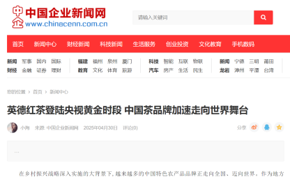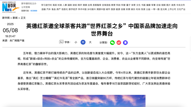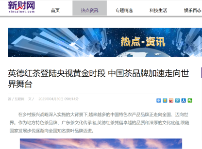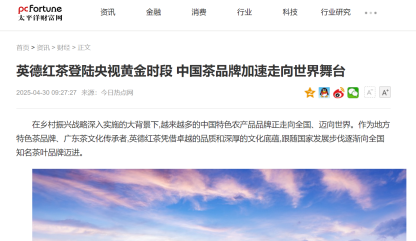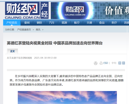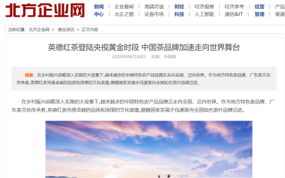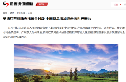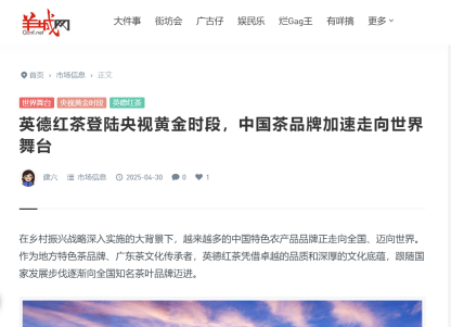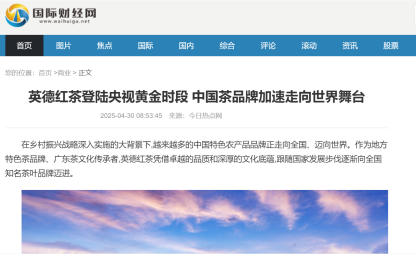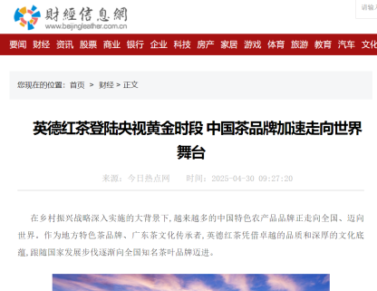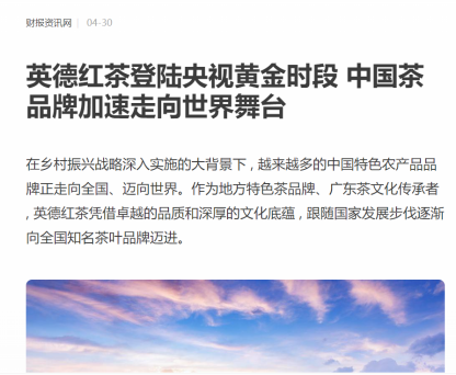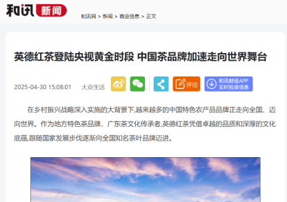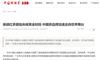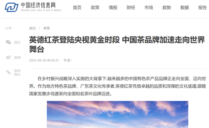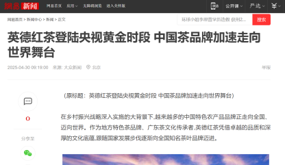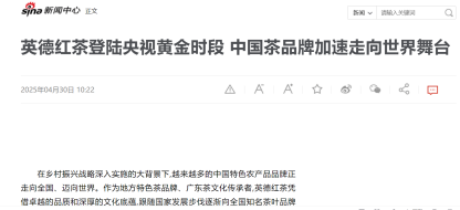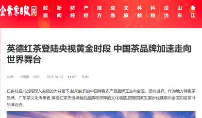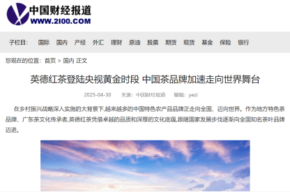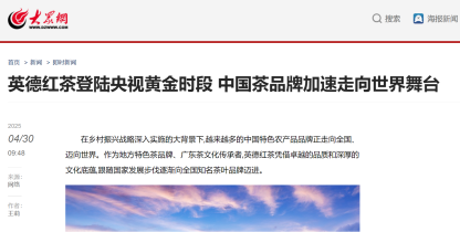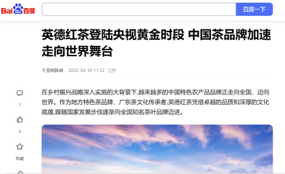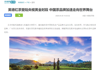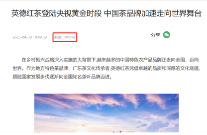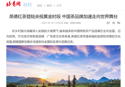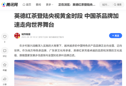 据了解,此次“英德红茶”5秒形象宣传片将首次上线中央电视台CCTV-13新闻频道《共同关注》栏目前18:54-18:55黄金广告时段。同时,还于CCTV-1、CCTV-13《朝闻天下》,CCTV-13《新闻直播间》,CCTV-10科技频道,CCTV-17农业农村频道等频道节目集中宣发,形成“早中晚”全时段覆盖,形成“新闻+综合+科技+农业”的立体传播矩阵,全方位覆盖政府、企业、消费者、农业从业者等不同群体,向全球传递“世界高香红茶”的浓醇甜香。