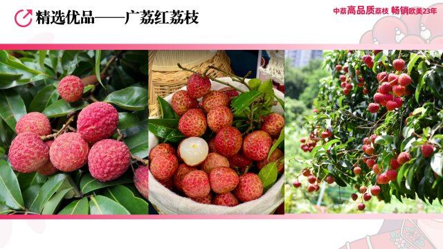 活动上,中荔集团推出了多款新品——火山岩荔枝、广荔红荔枝、迟美人荔枝。火山岩荔枝生长于富含矿物质的火山岩土壤中,果实色泽鲜艳、口感清甜。广荔红荔枝果肉厚实、汁水丰富,具有浓郁的荔枝香气。迟美人是中荔专利品种,其晚熟的特性延长了荔枝的供应期。“中荔集团希望以高品质的火山岩荔枝抢占早市,广荔红荔枝称霸中盘,迟美人荔枝收割晚市。从5月到9月,都能带来高品质的荔枝走上国际餐桌。”中荔农业集团副总经理陈智新如此介绍。