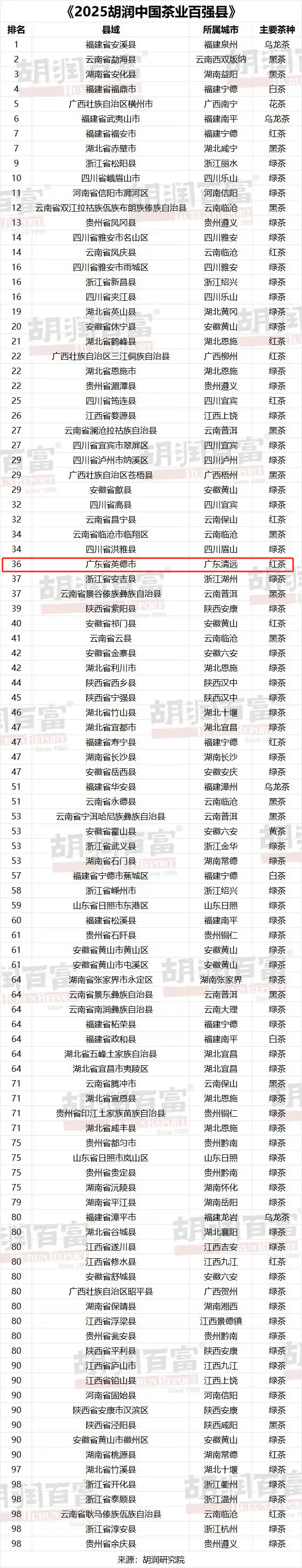 5月19日,胡润研究院发布《2025胡润中国茶业百强县》。该榜单基于茶叶种植面积、产量、产值及品牌影响力等多维度评选而出。广东省英德市入选,且为广东省唯一入选县域。