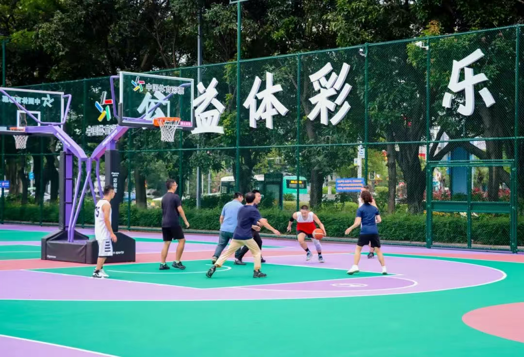 “快!传球!”“进了,好球!”傍晚5点半,正值篮球场免费开放时段,附近小区的篮球爱好者汇聚于此,挥洒汗水。抢断、传球、投篮,所有动作一气呵成;快攻、突破、防守,场上角逐紧张激烈、扣人心弦。夜幕降临,行云流水的精彩进球,不断引发观众的喝彩声,球场四周的“公益体彩 乐善人生”全发光灯牌标语与场上群众挥洒汗水的身影相映成趣,构成了城市夏日里一幅动感十足的全民健身画卷。