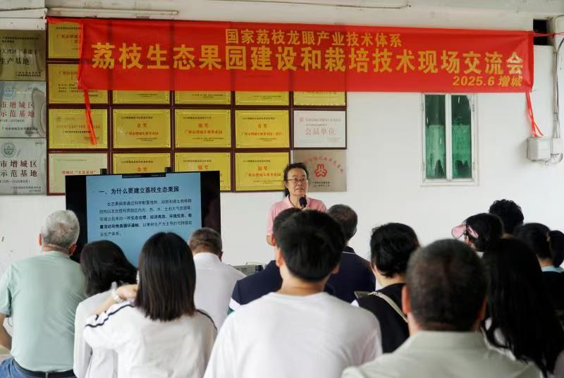 华南农业大学教授周碧燕代表体系栽培生理与生态岗位向大家介绍荔枝栽培技术的研发和应用成果,包括树体矮化、园地平整和宜机化改造、水肥一体化设施升级等措施,重点介绍了通过监测气象因子实施精准花果梢管理,以及果园生草栽培提升果园生态环境等技术方案和成果。东林果场负责人分享了果园升级改造经验,介绍了与华南农业大学科研团队合作的成效。