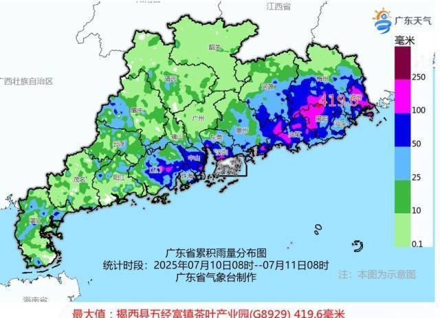 “丹娜丝”残余涡旋在广东境内逗留,受其影响,10日白天到11日早晨,梅州南部、粤东和珠三角南部市县出现了暴雨到大暴雨,揭阳揭西五经富镇出现了特大暴雨,累积雨量达419.6 毫米,其余市县出现了中到大雨局部暴雨。