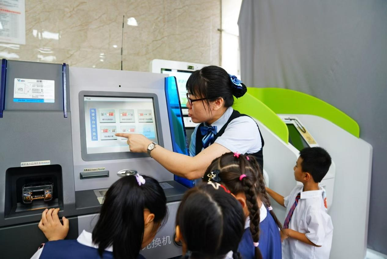 在银行大厅,邮储银行韶关市城区支行工作人员带领 “小小银行家” 们,操作 “纸硬币自助兑换机”。屏幕上清晰显示兑换界面,工作人员指尖轻点,耐心讲解操作流程,从选择面额到完成兑换,把金融服务知识拆解成易懂步骤。孩子们围在机具旁,眼神里满是好奇,小手跟着比划,沉浸式解锁现金自助服务技能。