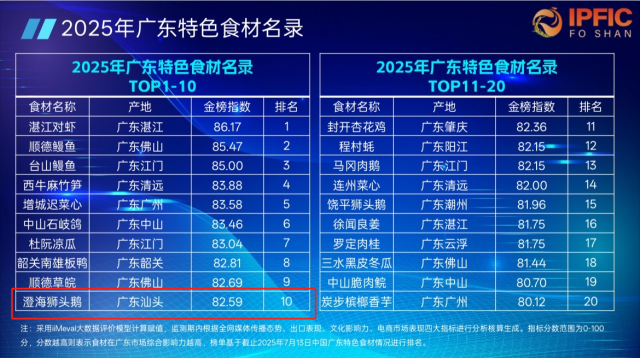 7月18日,第三届中国国际(佛山)预制菜产业大会在佛山顺德开幕。现场,2025年广东特色食材名录TOP20榜单重磅发布,来自汕头的澄海狮头鹅金榜指数82.59,排名第10位。