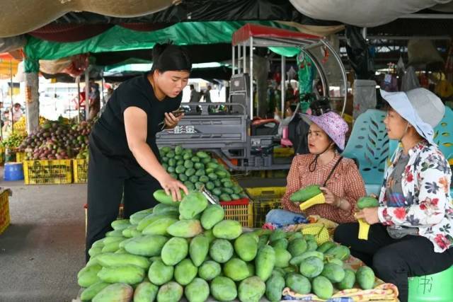 夏日时节,广西百色田阳区到处弥漫着芒果的馥郁香气。作为享有“中国第一个芒果之乡”美誉的田阳区,已经形成了一条从种植、采摘到加工、包装、销售集一体的芒果产业链,为当地创造了大量就业机会,让居民在家门口就能增收致富。7月17日,笔者来到田阳区农副产品综合批发市场里看到,果农们忙着销售芒果,收购商通过雇佣工人开展分拣、套网、装箱、搬运等工作,市场中一派繁忙的景象。正在市场进行分拣工作的钟妙英告诉记者,每年的芒果季她都会来市场务工,每天大约有两百块钱左右的收入。