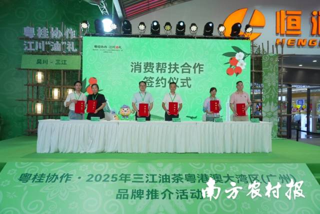 活动上,三江县民心酒业有限公司、三江县华强农业技术有限公司、广西宇盛农业发展有限公司、广西三椿生物科技有限公司、三江侗族自治县仙池茶业有限公司、三江县稻香山茶油生态发展有限公司,分别与东莞市万江区易武呈祥号茶业、广州穗粤贸易发展有限公司、广州市西科电商公司、广州市佳顺汽车用品有限公司、广东南方乡投产业发展有限公司、广州市东旺(国际)食品批发市场达成消费帮扶产销合作,将共同推动三江油茶产品“出山入湾”。