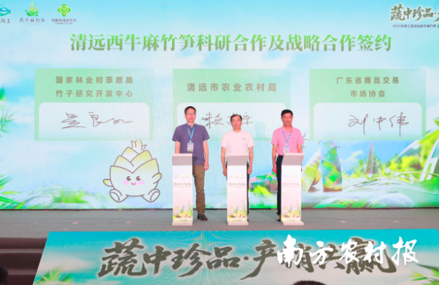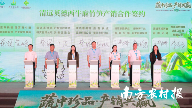 活动现场,清远市农业农村局与国家林业和草原局竹子研究开发中心、广东省商品交易市场协会达成战略合作,英德市农业农村局与英德农商银行、英德市麻竹产业协会达成融资合作,6家清远笋企、协会与10家主销区采购商达成采购签约或产业链物流合作签约。清远市广盐食品有限公司副总经理胡舜和成都吉食道食品有限公司采购负责人张诚还上台分享企业与西牛麻竹笋的新鲜故事。