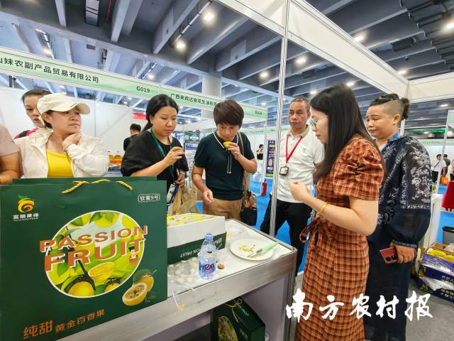 “这次我们带来了甜度很高的钦蜜9号黄金百香果,鲜食、制果汁都非常合适。”广西田阳玖丰农业科技有限公司总经理傅旭安说。