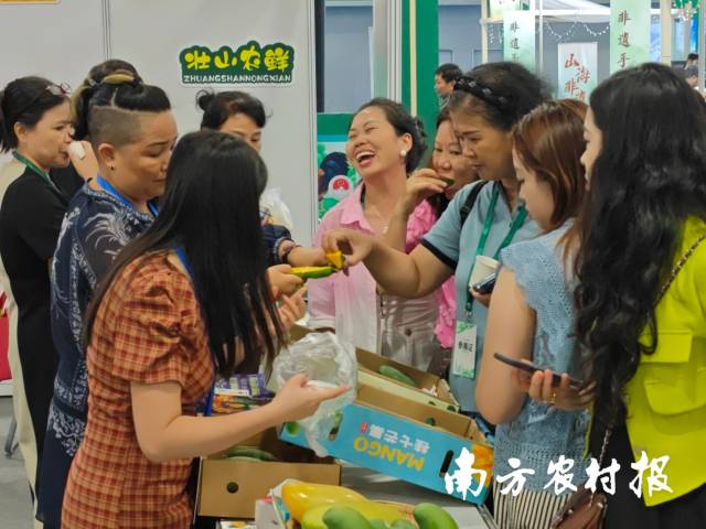 田阳区地处广西西部,右江河谷腹地,素有“天然温室”美誉,凭借得天独厚的自然条件,是著名的全国南菜北运基地。作为“中国第一个芒果之乡”,百色市田阳区芒果季虽然即将甜蜜收官,来自田阳的“拳头产品”黄金百香果已接力上市,后续还将有圣女果、柑橘等优质果蔬接连推出,为湾区消费者奉上全年不间断的甜蜜。“我们展区展示的芒果干全部由田阳芒果鲜果制作,品质很好,现场观众尝过都很喜欢。”参展企业代表韦文明介绍,虽然今年芒果季接近尾声,但芒果干、芒果酒等加工产品可以全年供应,持续满足市场需求。