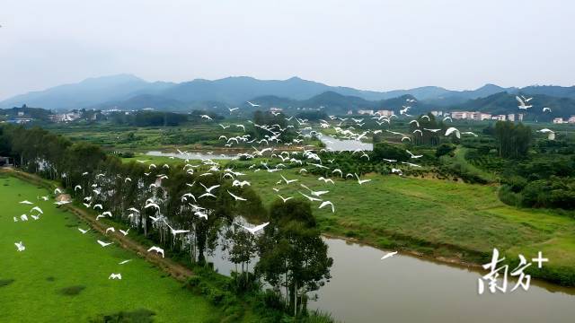 近日,郁南县建城镇东一村委梅花营村的田野间迎来一群特殊的“访客”。近百只白鹭在稻田与河岸间轻盈起舞,或低空盘旋觅食,或驻足梳理羽毛,洁白的羽翼与碧水青山相映成趣,勾勒出一幅和谐灵动的生态画卷。