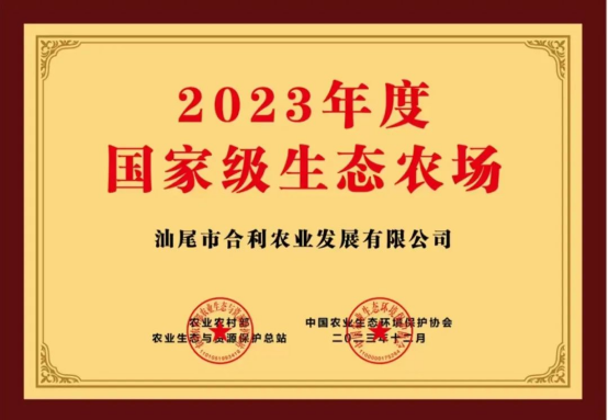 日前,农业农村部农业生态与资源保护总站、中国农业生态环境保护协会2023年度国家级生态农场名单公布,汕尾市合利农业发展有限公司被授予“国家级生态农场”称号。