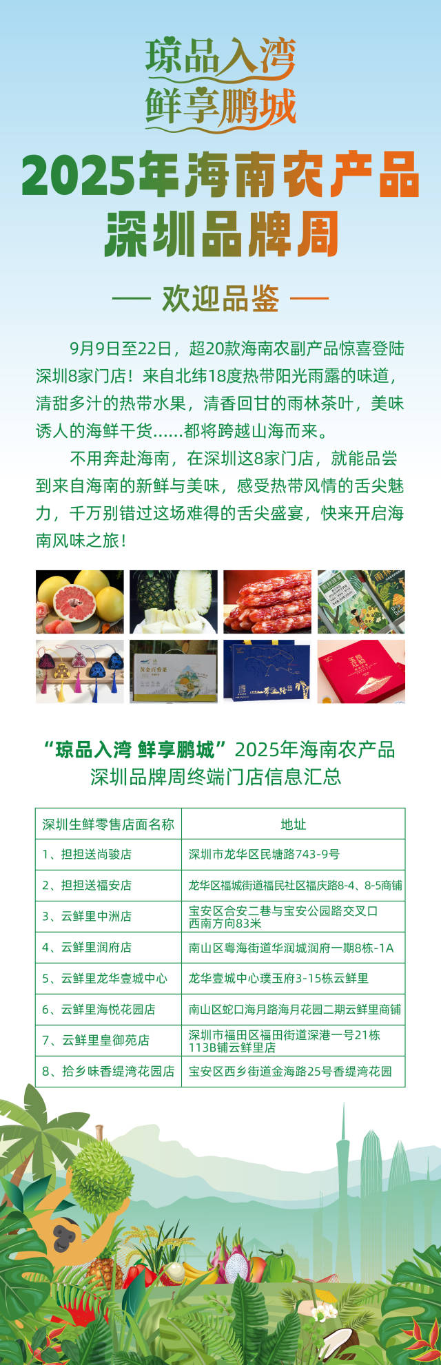 作为推介会的延伸活动,“琼品入湾 鲜享鹏城”海南农产品深圳品牌周将于9月9日至22日在深圳多家连锁门店开展。消费者可近距离体验海南农特产品,参与试吃促销活动。此举旨在提升海南农产品在大湾区的知名度和市场份额,推动消费帮扶成果落地见效。