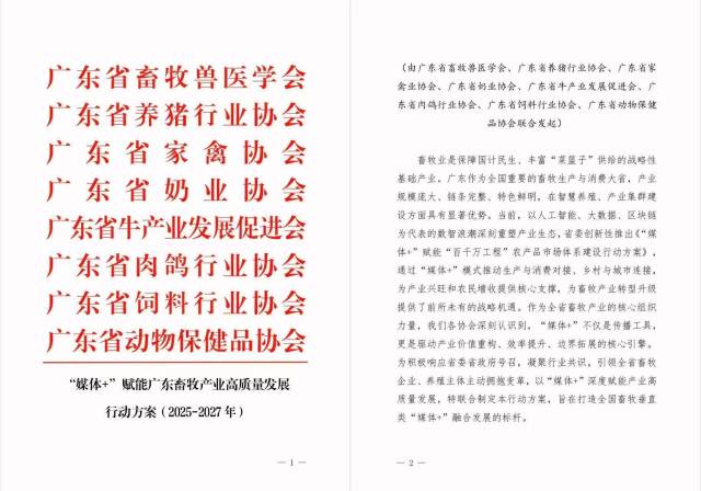 产业的突破发展离不开行业的协同共进。今年8月,广东省畜牧业八大协会(广东省畜牧兽医学会、广东省养猪行业协会、广东省家禽业协会、广东省奶业协会、广东省牛产业发展促进会、广东省肉鸽行业协会、广东省饲料行业协会)联合制定《“媒体+”赋能广东畜牧产业高质量发展行动方案(2025-2027年)》,旨在凝聚行业共识,引领全省畜牧企业、养殖主体主动拥抱变革,以“媒体+”深度赋能产业高质量发展,打造全国畜牧垂直类“媒体+”融合发展的标杆。