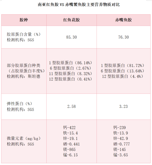 近年来对于鱼胶营养价值的研究更是表明,南亚红鱼胶的胶原蛋白含量高达85.3%,且胶原蛋白种类丰富,尤其6型胶原蛋白含量突出——而6型胶原蛋白,就是子宫、真皮、软骨组织的关键组成部分。