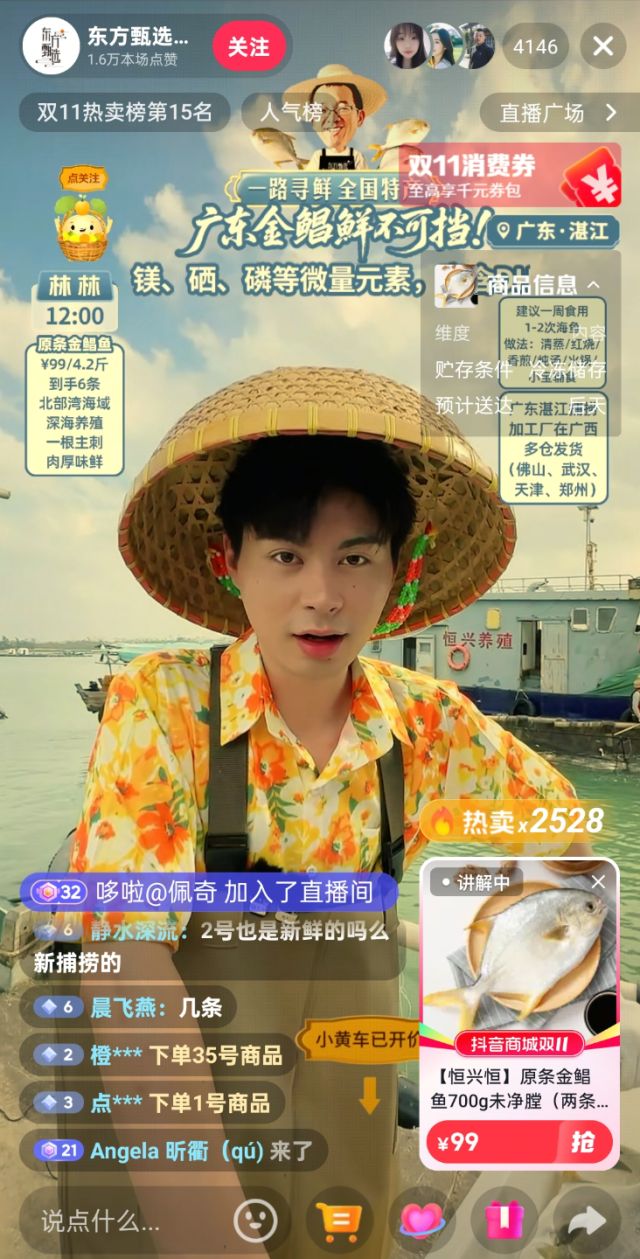 “湛江金鲳鱼,又鲜又香!3、2、1,上链接!”随着主播喊着倒计时,湛江海域的金鲳鱼通过直播间游向了全国各地的餐桌。10月11日,东方甄选在湛江开启双节后首场落地海上的直播,吸引了超过200万人线上观看,创下5.8万单订单量、卖出34.8万条、总销售额超600万元的亮眼成绩。这场没有明星大咖助阵的直播之所以成功,凭借的正是广东金鲳鱼的品质魅力。