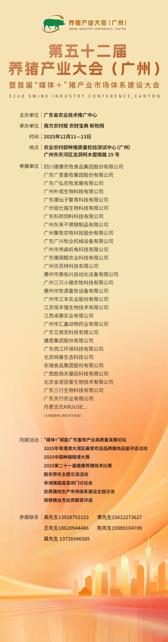 2025年12月11-13日,第五十二届养猪产业大会(广州)将于广州柯木塱农业农村部种猪质量检验测试中心隆重召开。