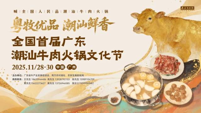 2025年11月28-30日,全国首届广东潮汕牛肉火锅文化节将在广州盛大举办,本届文化节以 “粤牧优品,潮汕鲜香 —— 喊全国人民品潮汕牛肉火锅” 为核心主题,由南方报业传媒集团主办,南方农村报、农财宝典、新牧网承办。