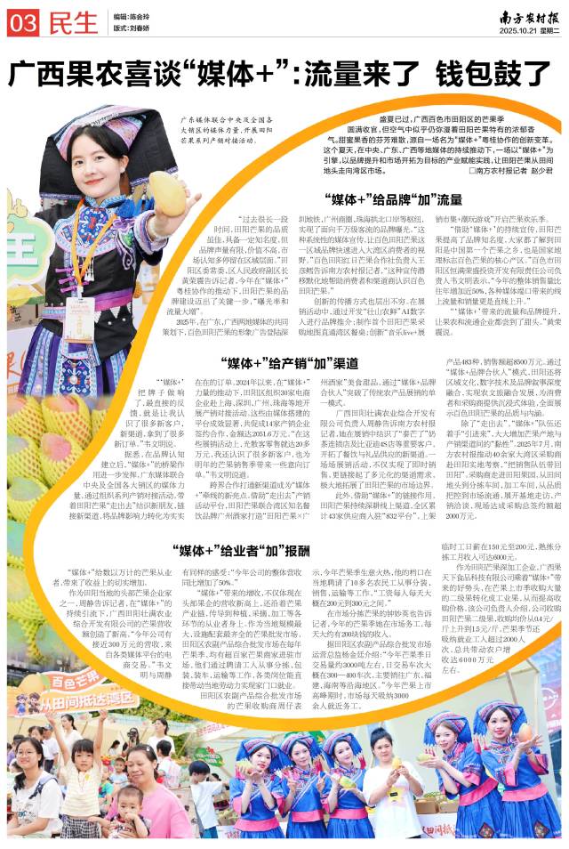 作为田阳当地的头部芒果企业家之一,周静告诉记者,在“媒体+”的持续引流下,广西田阳壮满农业综合开发有限公司的芒果营收额创造了新高,“尤其是电商销售,今年公司有接近300万元的营收,来自各类媒体平台的电商交易。”韦文明与周静有同样的感受,“今年公司的整体营收同比增加了50%。”