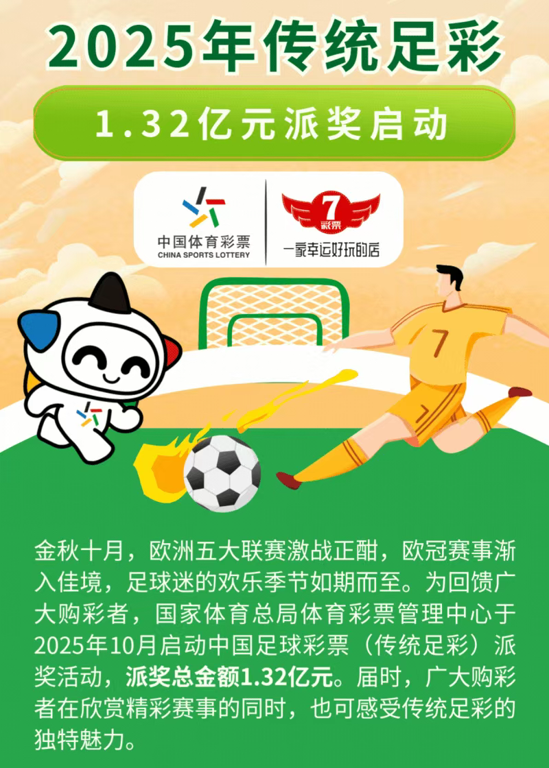 金秋十月,欧洲五大联赛激战正酣,欧冠赛事渐入佳境,足球迷的欢乐季节如期而至。记者从广东省体彩中心获悉,为回馈广大购彩者,国家体育总局体育彩票管理中心将于2025年10月25日启动中国足球彩票(传统足彩)派奖活动,派奖总金额1.32亿元。届时,广大购彩者在欣赏精彩赛事的同时,也可感受传统足彩的独特魅力。