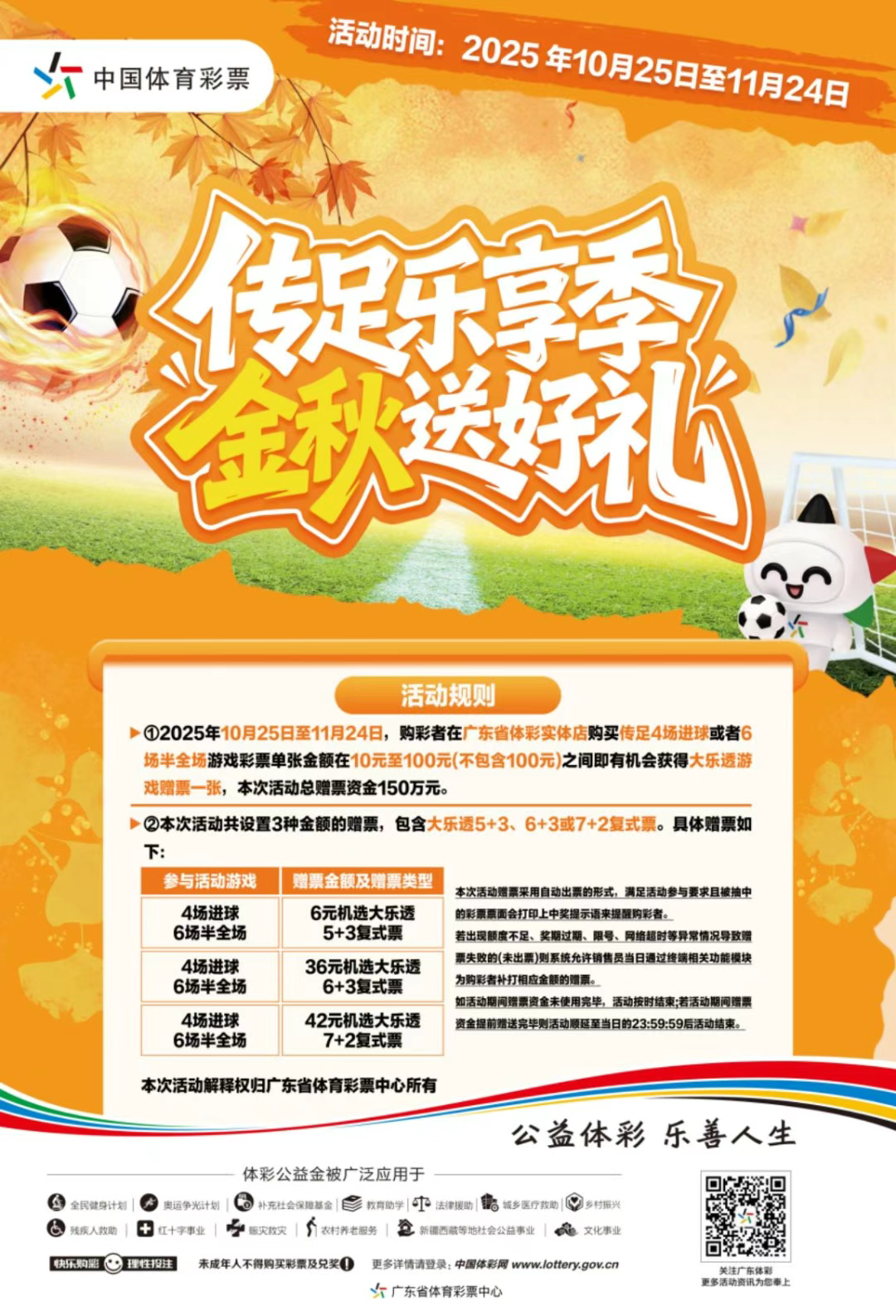 近日,记者从广东省体彩中心获悉,为回馈广大购彩者对传统足彩的长期支持,广东体彩精心策划的“传足乐享季 金秋送好礼”传足赠票活动,将于2025年10月25日至11月24日火热开展。本次活动为省内购彩者送上实实在在的购彩福利,只需购买指定传统足彩游戏,即有机会免费获得大乐透机选复式赠票。