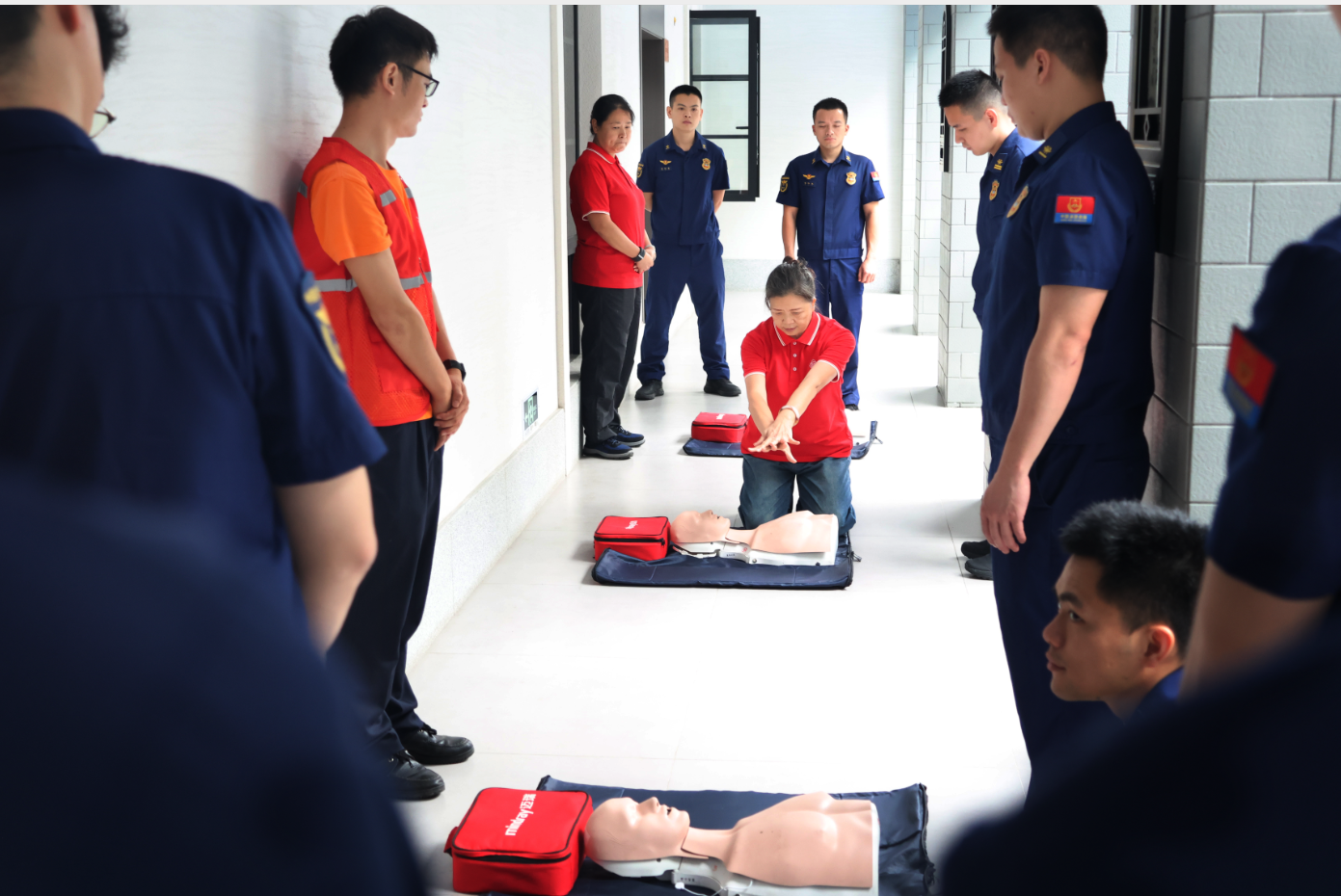 启动仪式一结束,会议室迅速切换为“急救培训课堂”。蓝态AED急救行动志愿服务队的公益讲师阳小娟立即展开教学,40分钟的培训全程聚焦“实战”。讲师手持人体模拟人,逐步骤演示心肺复苏的按压位置、力度与频率。针对AED设备,从开机、贴电极片到按下“电击键”,拆解每一个操作细节。消防指战员分组上前实操,助教志愿者一对一纠正动作,确保“人人能上手、操作零失误”。