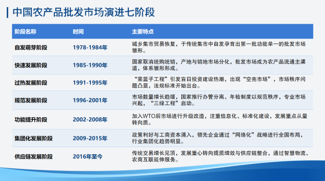 “如果把 40 年压缩成一天,前 6 小时只为解决‘有没有’,中间 12 小时忙‘够不够’,后 6 小时才轮到‘好不好’。”马增俊用“七段式”年轮梳理行业变迁。中国农产品批发市场的发展经历了自发萌芽(1978-1984)、快速发展(1985-1990)、过热发展(1991-1995)、规范发展(1996-2001)、功能提升(2002-2008)、集团化发展(2009-2015)和供应链发展(2016至今)七个阶段。